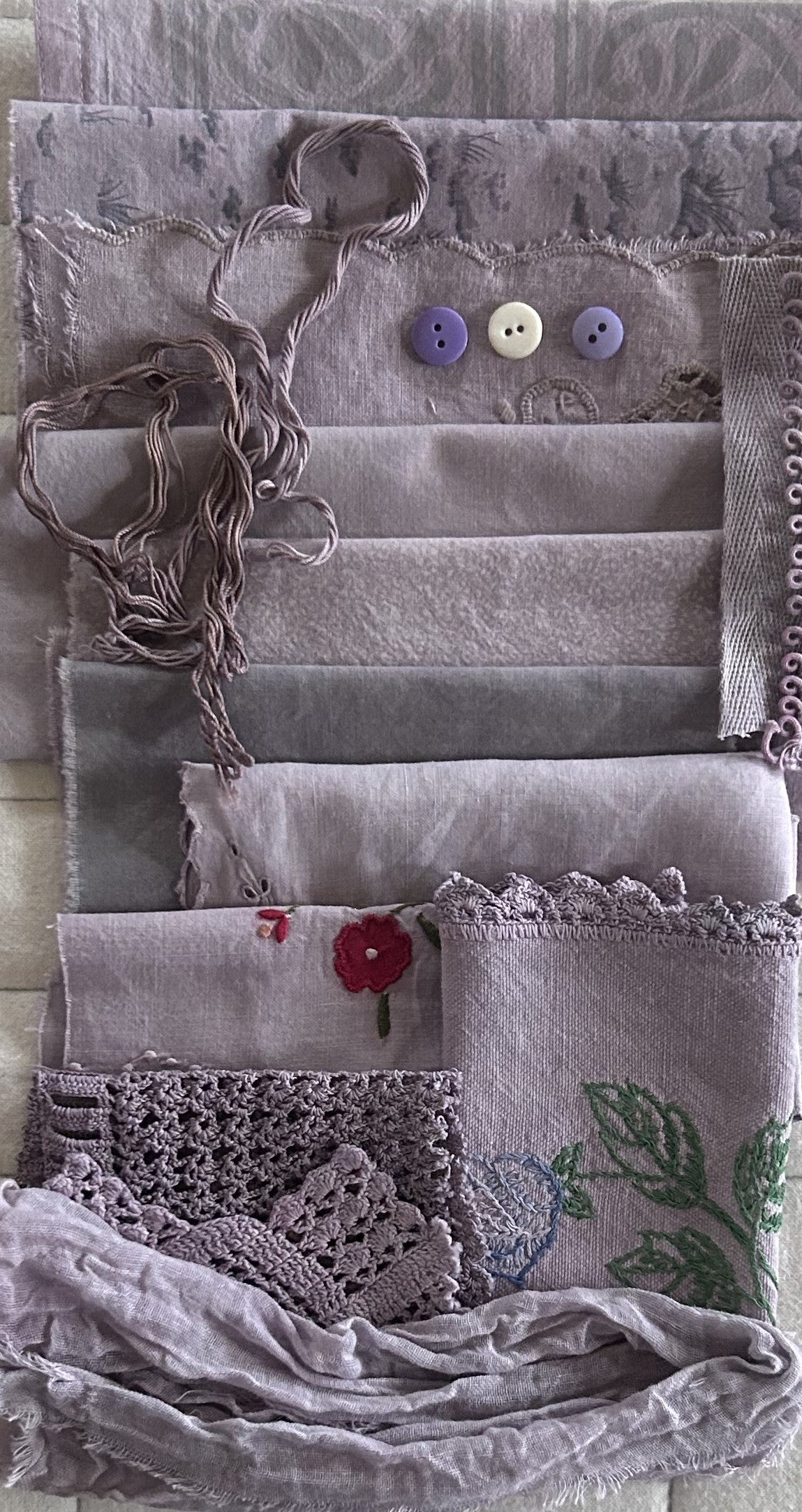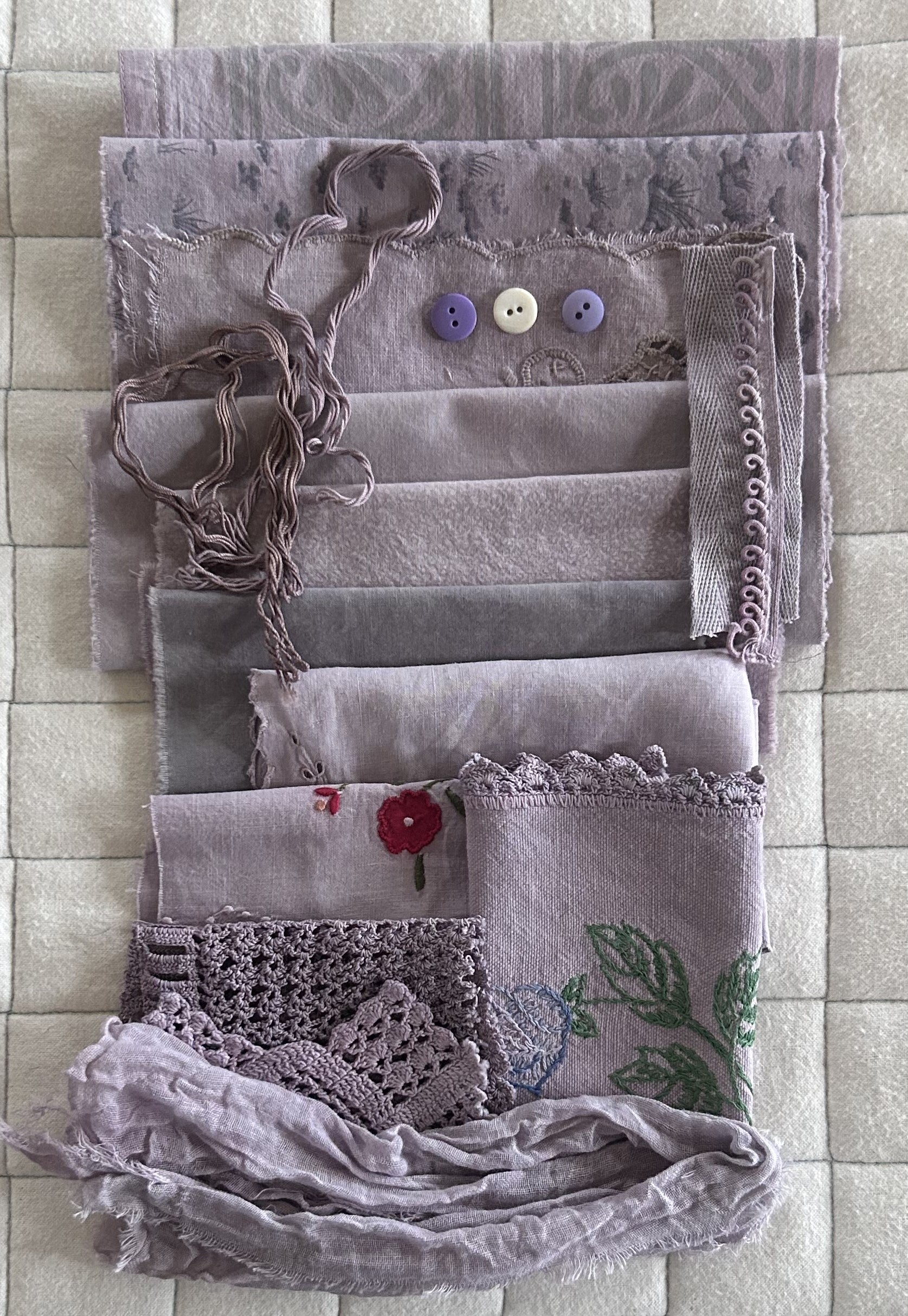 A one-of-a-kind slow stitching collection inspired by the soft violet and earthy tones of the scabiosa flower. This thoughtfully curated bundle includes a mix of repurposed cottons, linen, trims, lace, and threads—all plant dyed by hand to create natural variation and depth of color.