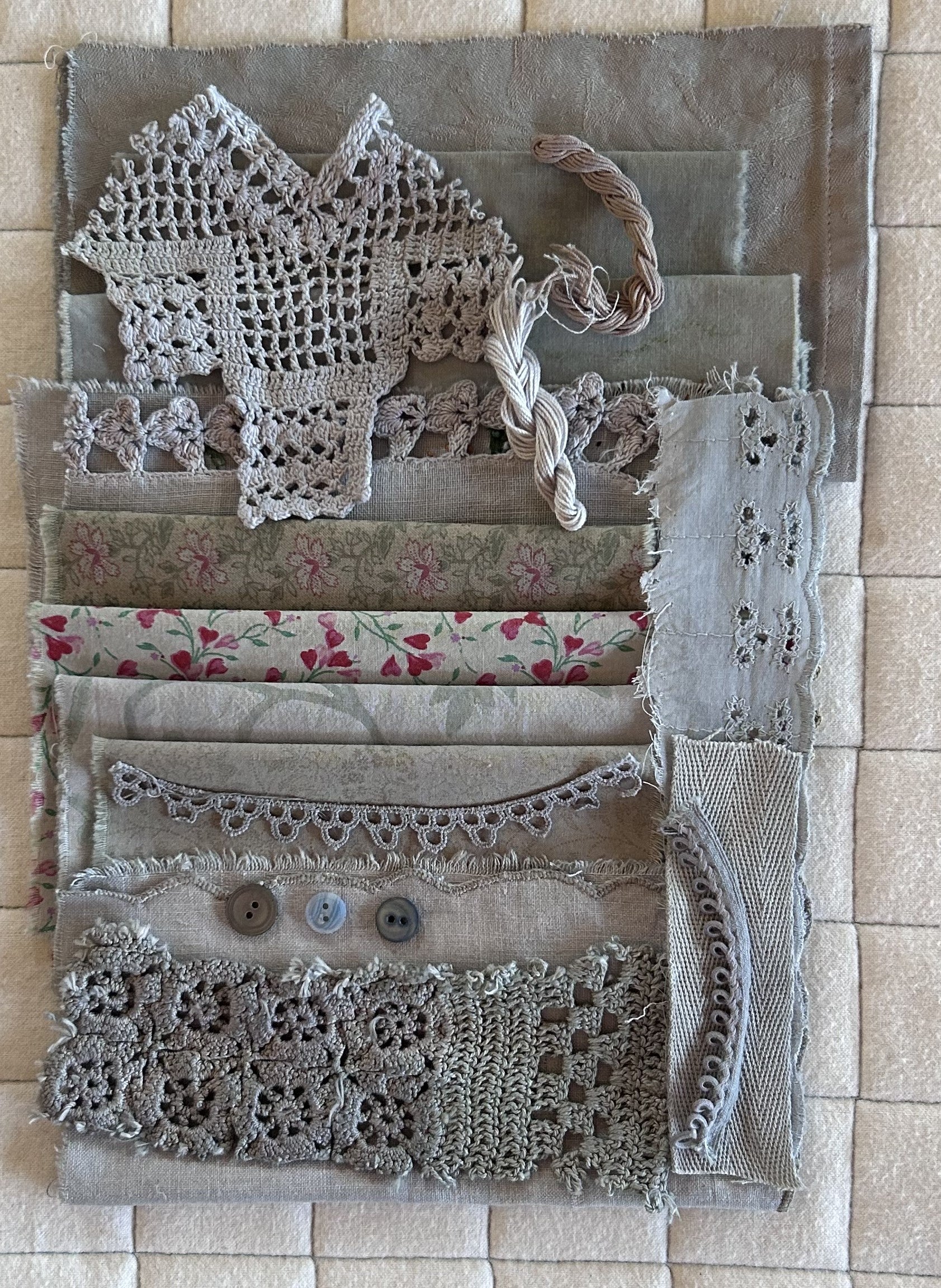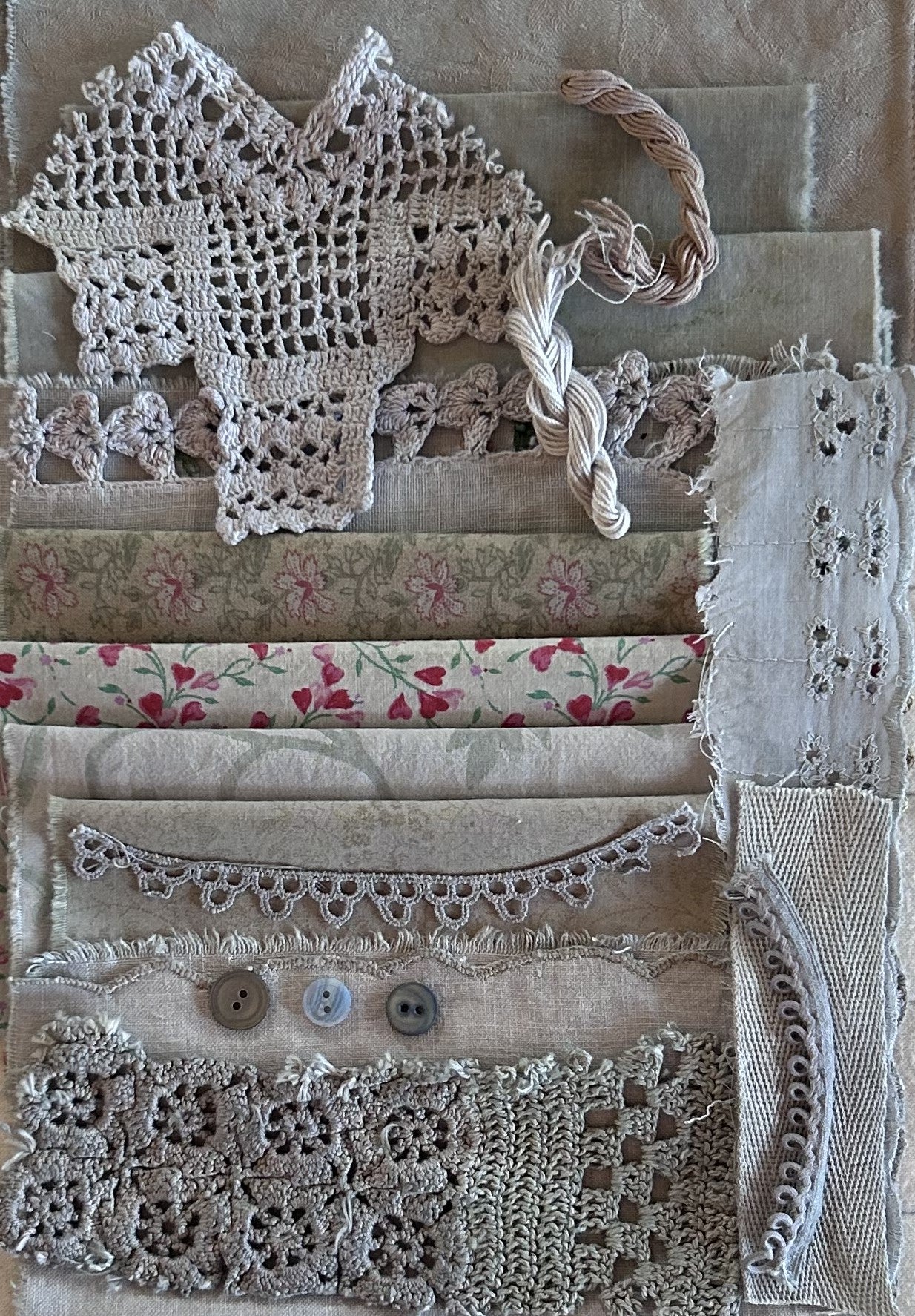 BLACK SCABIOSA with Iron Plant Dyed Bundle Which Includes Repurposed Cottons, Linen, Trims, Lace, and Thread for Slow Stitching Projects