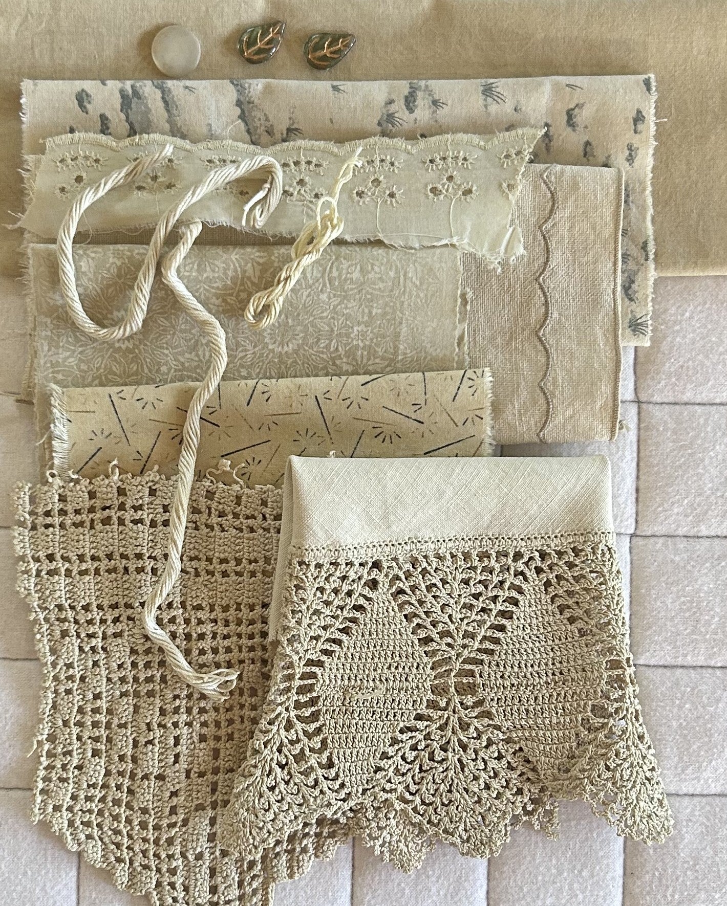 CARROT TOPS Plant Dyed Bundle Which Includes Repurposed Cottons, Linen, Trims and Thread for Slow Stitching Projects