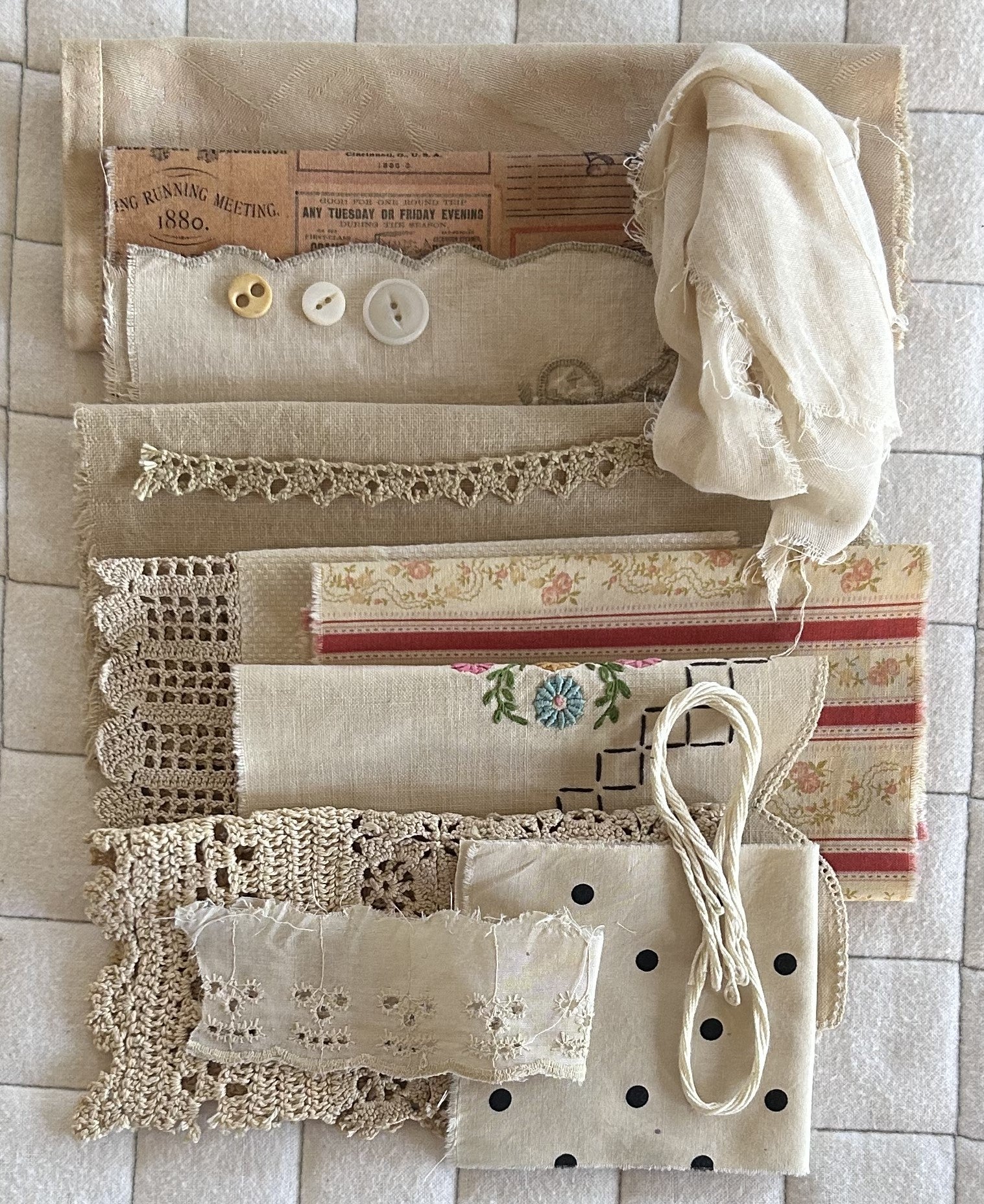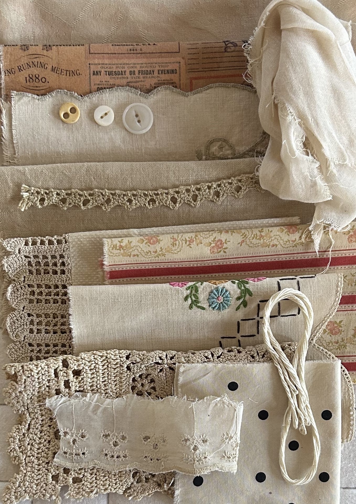 Soft and romantic, this CONEFLOWER and GLADIOLOAS Plant Dyed Bundle features a curated mix of repurposed cotton and linen fabrics, all naturally dyed using flowers to achieve light peachy-tan tone. Each bundle includes an assortment of hand-dyed textiles, vintage lace, trims, cotton threads, and buttons—perfect for slow stitching, textile collage, visible mending, and other mindful handwork. Sustainable and one-of-a-kind, this bundle brings new life to old materials through the beauty of natural color.
