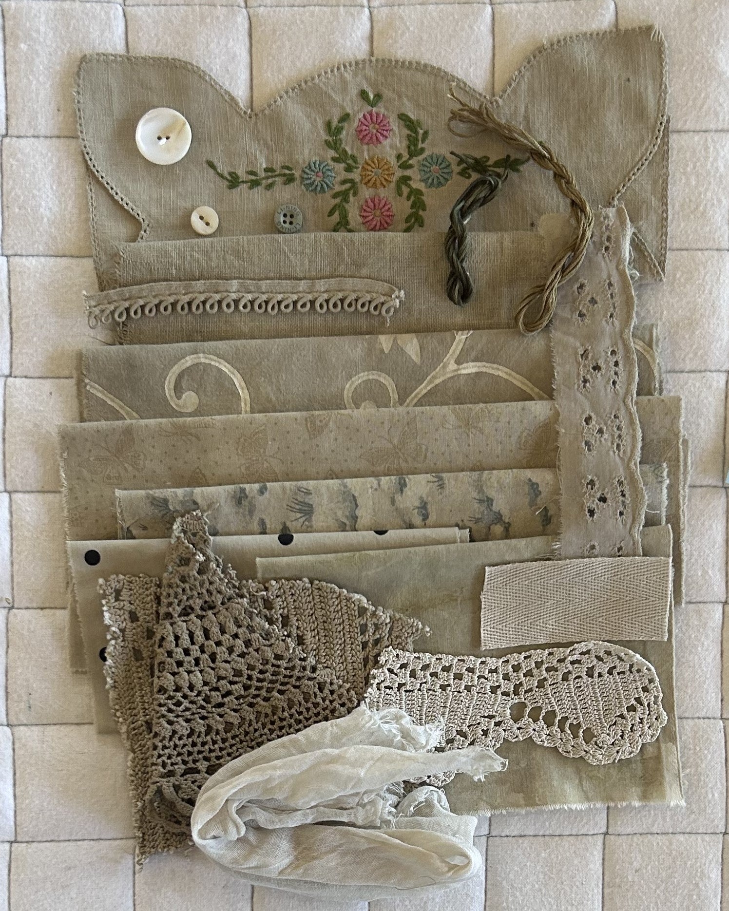 A thoughtfully curated collection of naturally dyed textiles, created using elder flower with iron to produce soft, earthy hues and subtle variations unique to each piece. This bundle features a mix of repurposed cottons, linen, trims, lace, and thread—each infused with botanical character and layered history.