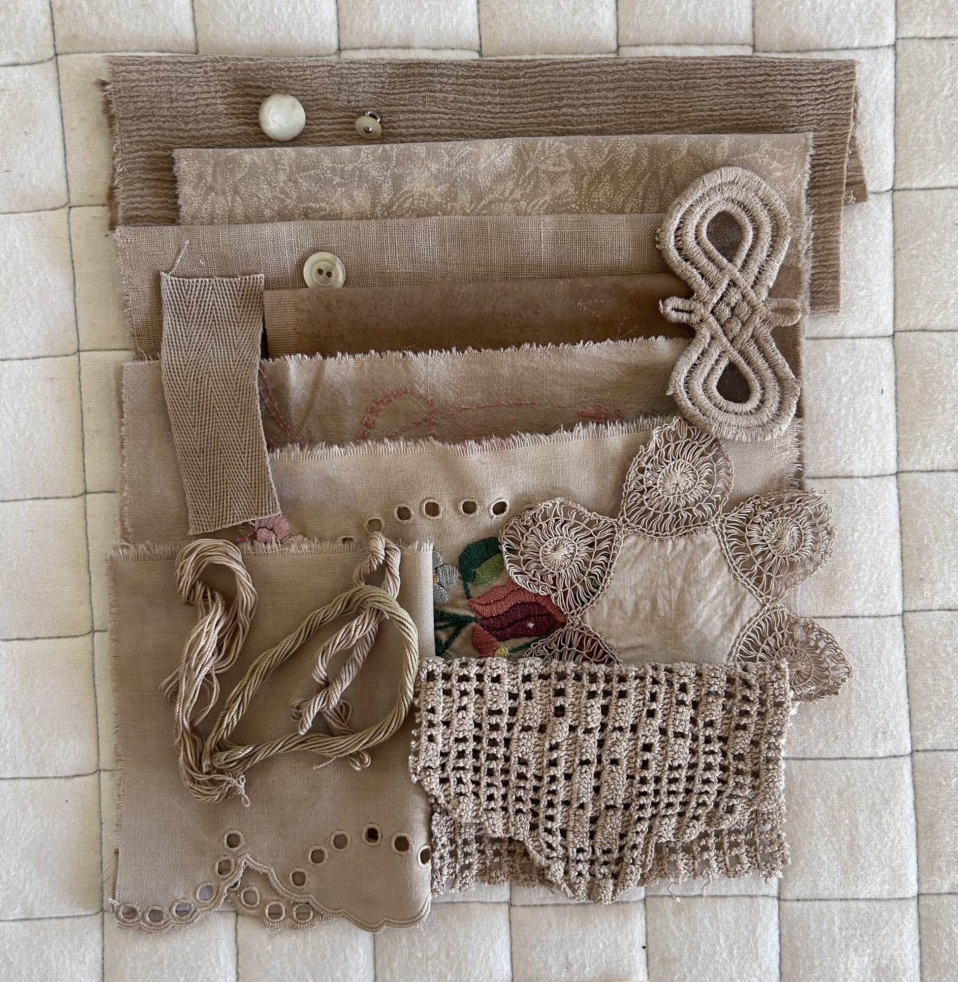 WALNUT and ROSE Plant Dyed Bundle Which Includes Repurposed Cottons, Linen, Trims, Lace, and Thread for Slow Stitching Projects