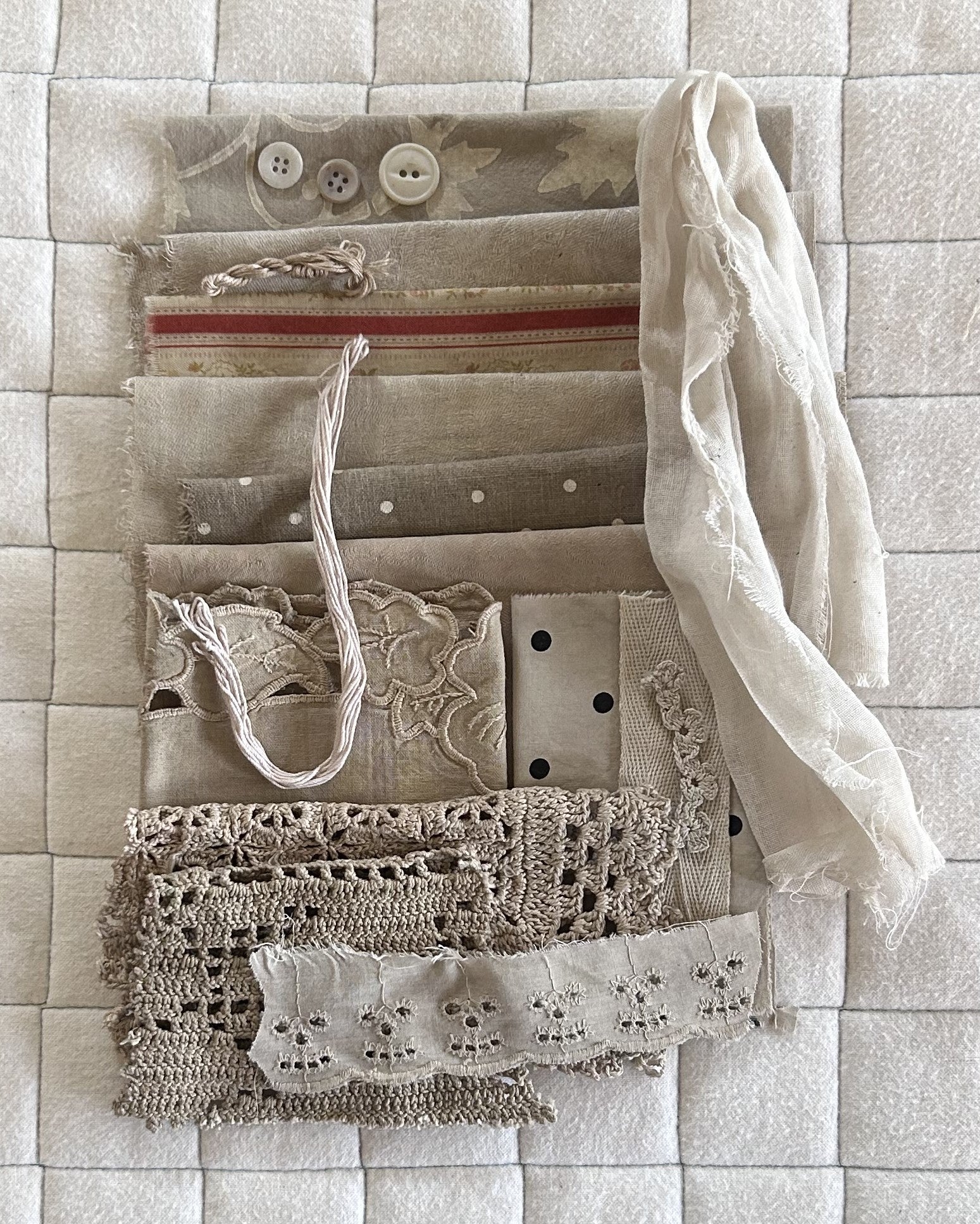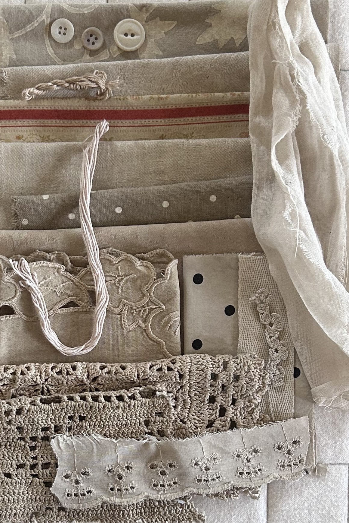 WALNUT, Light Plant Dyed Bundle Which Includes Repurposed Cottons, Linen, Trims, Lace and Thread for Slow Stitching Projects